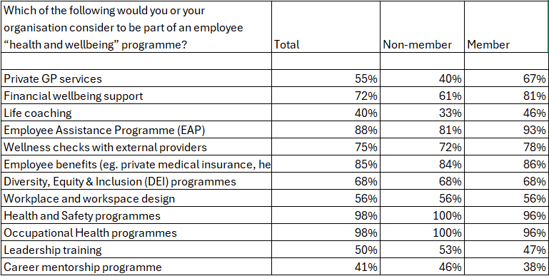 When respondents were asked to share their opinion of what sits within a health and wellbeing programme, the answers reflected a discipline that increasingly touches almost every part of working life.