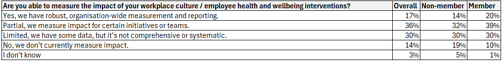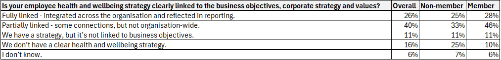 There are also notable gaps in fully linking wellbeing strategy to organisational values and DE&I — even where strategy intent is strong.