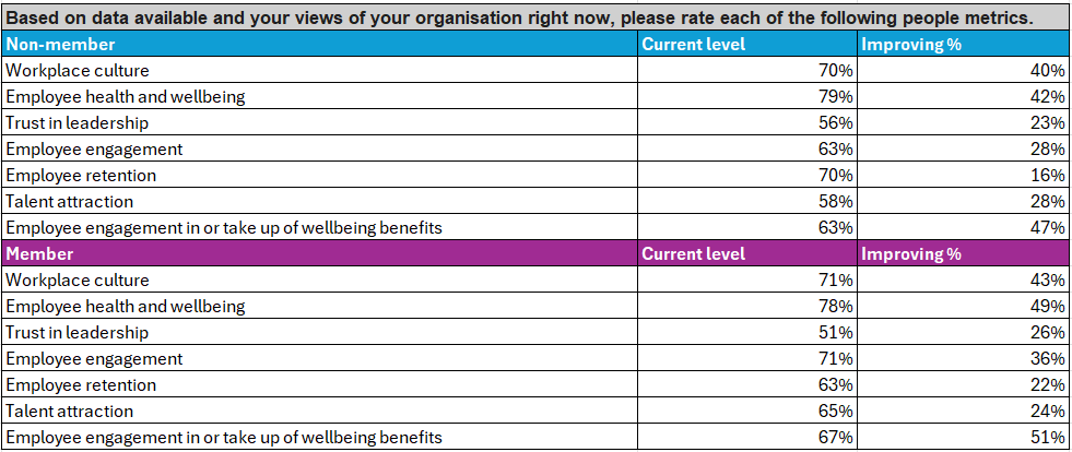 3. Organisations are seeing improvement in health and wellbeing-related people metrics – but trust remains challenging.